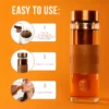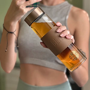 Made from high-quality eco-friendly glass with a stainless steel infuser, a leak-proof lid, and an ergonomic brown leather grip, it’s designed to move with you — from your morning workout to the office or your afternoon break.
